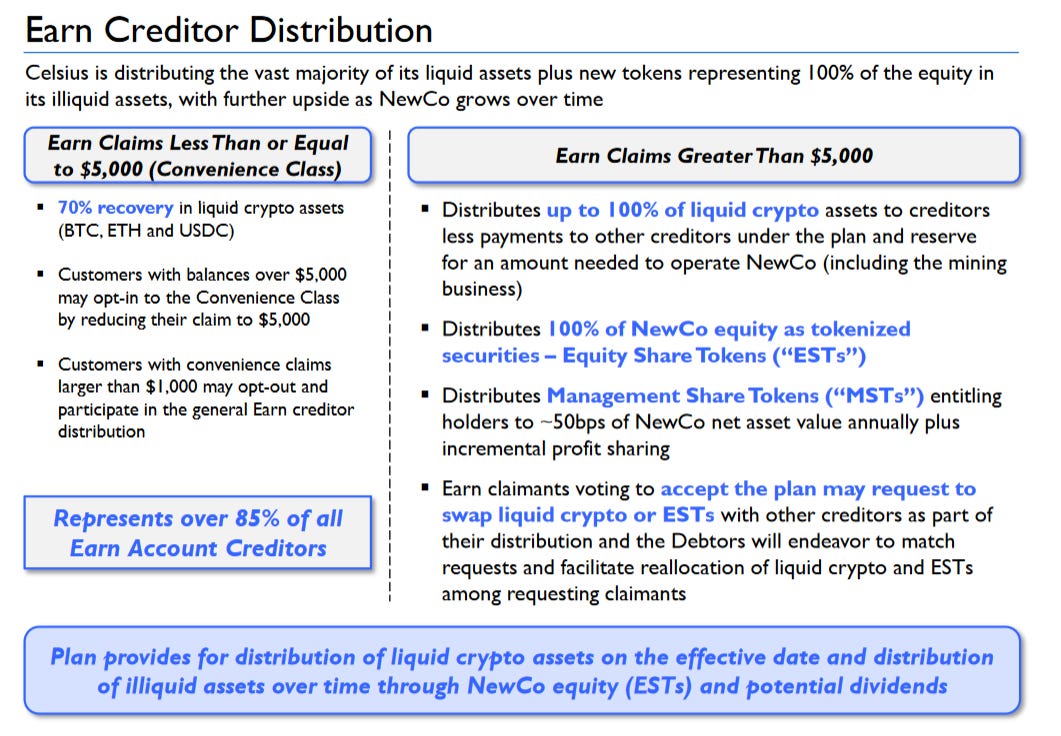 Celsius is reaching a sale plan for small debtors (below 5K) to recover 70% of their funds back, while larger debtors will receive 30-40%.