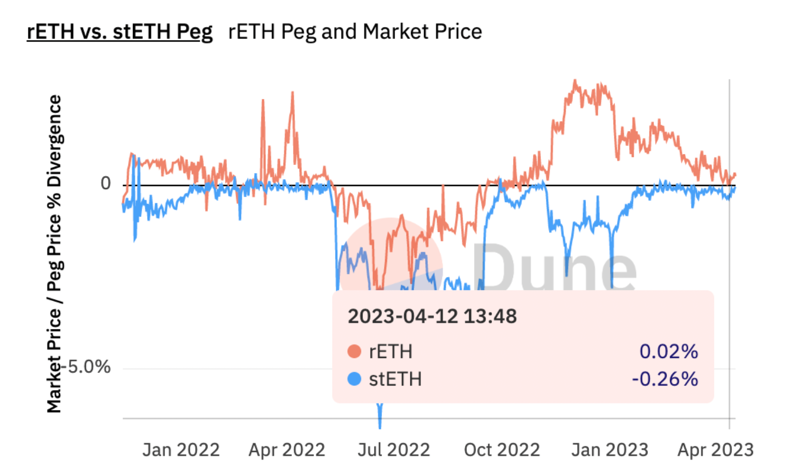Lido’s stETH was plagued with outsized sell pressure, depegging to a 0.26% discount from the underlying on April 12. While not dipping below peg, Rocket Pool’s rETH traded at 0.02% premium, a low not seen since October 2022.