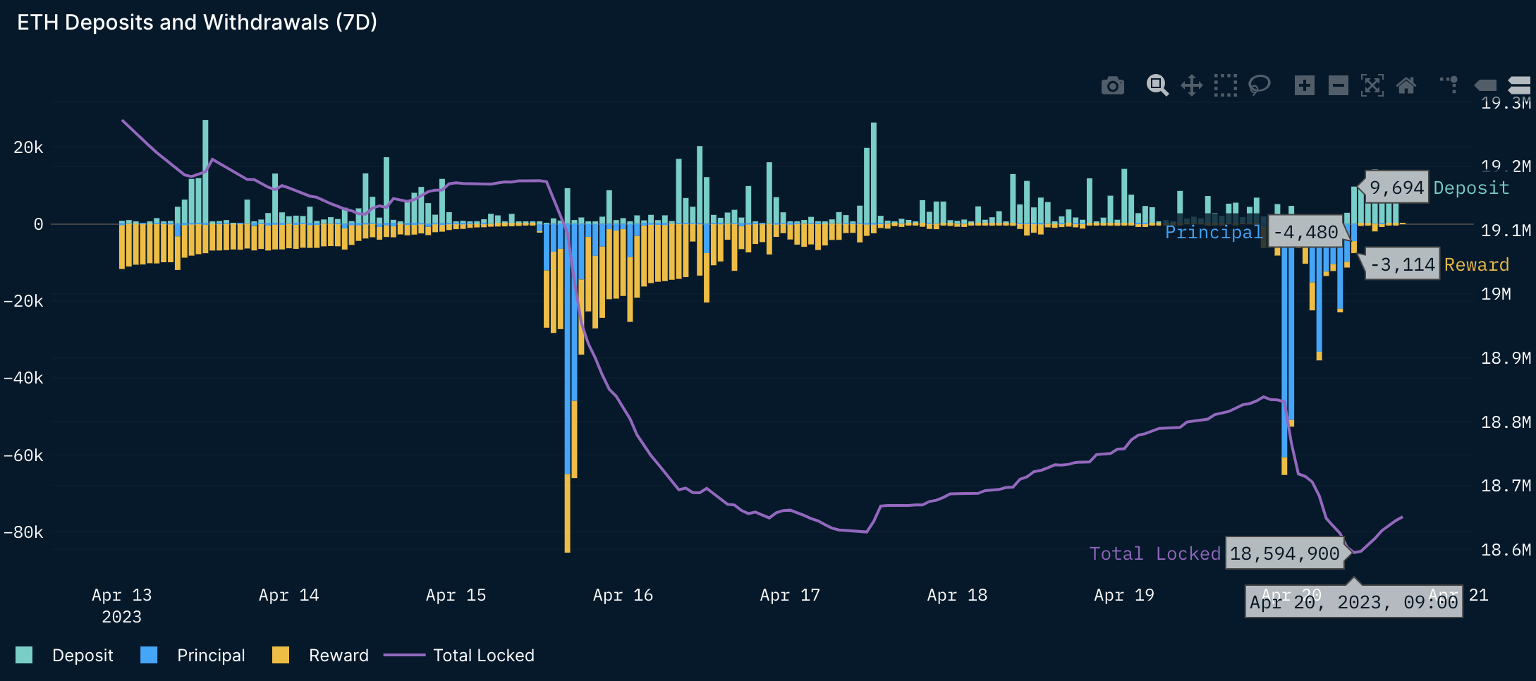 More than just an Ether-head conspiracy, the proof is now in the pudding. Although locked ETH, including staking rewards, on the Beacon Chain was down only for the five days following Shapella, the trend reversed for 2 days on April 17, before falling on April 19.