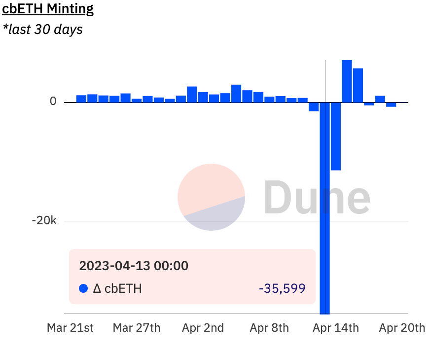Immediately post-withdrawals, cbETH redemptions surged, hitting 35.6k on April 13.