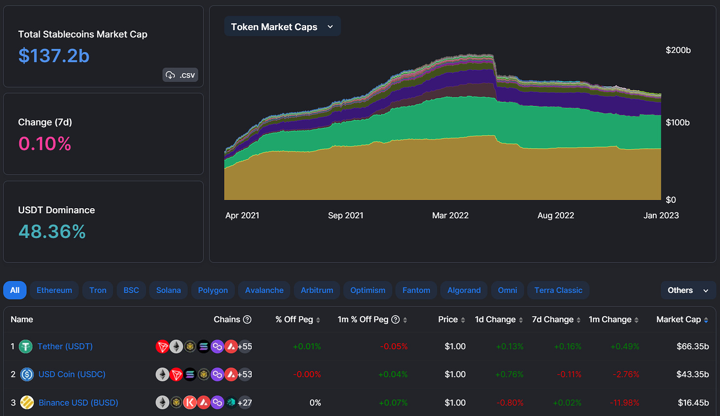 As you can guess from the name, the Stables dashboard is where you can go to check the pulse of DeFi’s stablecoin sector at any given time. The main overview page shows and visualizes the total aggregate market cap of all DeFi’s stablecoins, which is currently ~$137B.