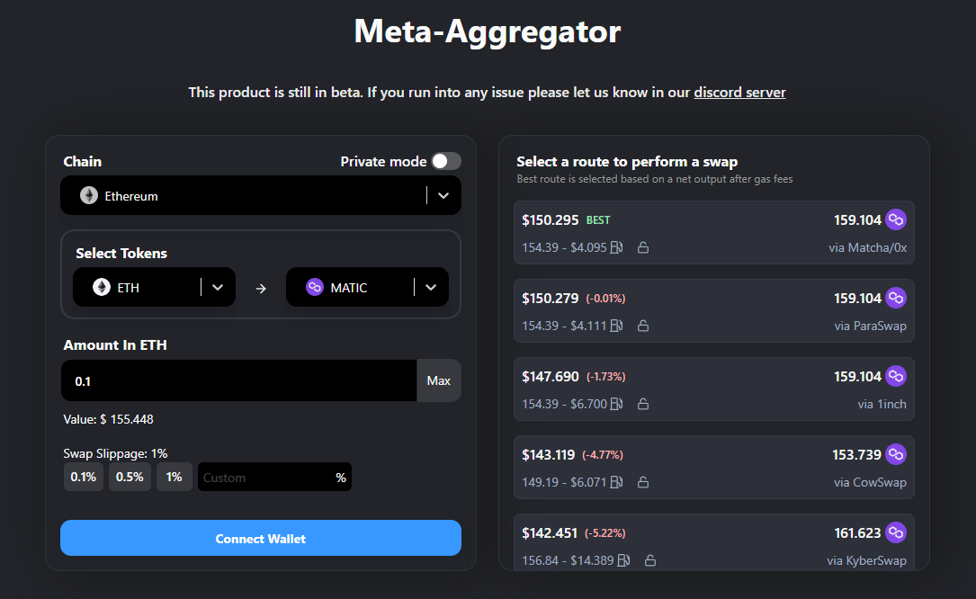 Lastly, one of DeFiLlama’s newest resources is its DEX Meta-Aggregator, a.k.a. LlamaSwap. While still in beta, this service aggregates other popular DEX aggregators like 1inch, CowSwap, and Matcha in order to offer traders the best, most-efficient routes for their DeFi trading needs. If you’re one to aim for the lowest-cost trades possible, consider checking out this DEX of DEXes.