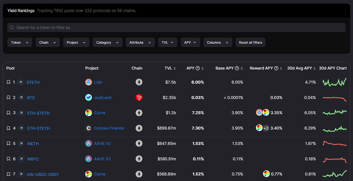 This is DeFiLlama’s homebase for the most important DeFi yield farming stats. Notably, the main Pools page presently tracks nearly 8,000 unique yield farming opportunities across +230 protocols and +50 chains.