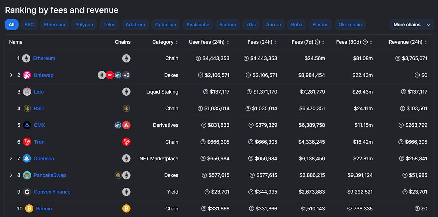 This data hub is where you can quickly compare how much fee payments chains and DeFi apps have accrued over 7-day and 30-day periods. The dashboard also shows 24-hour revenue stats, i.e. the cut of the past day’s fee payments that have been returned to token holders and/or a project’s treasury. Want to see if a protocol is profitable? This is a great place to start!