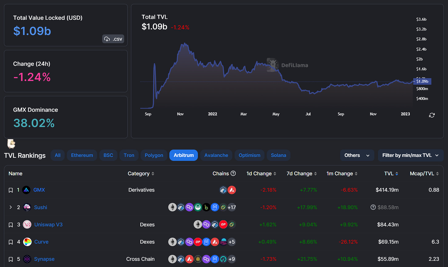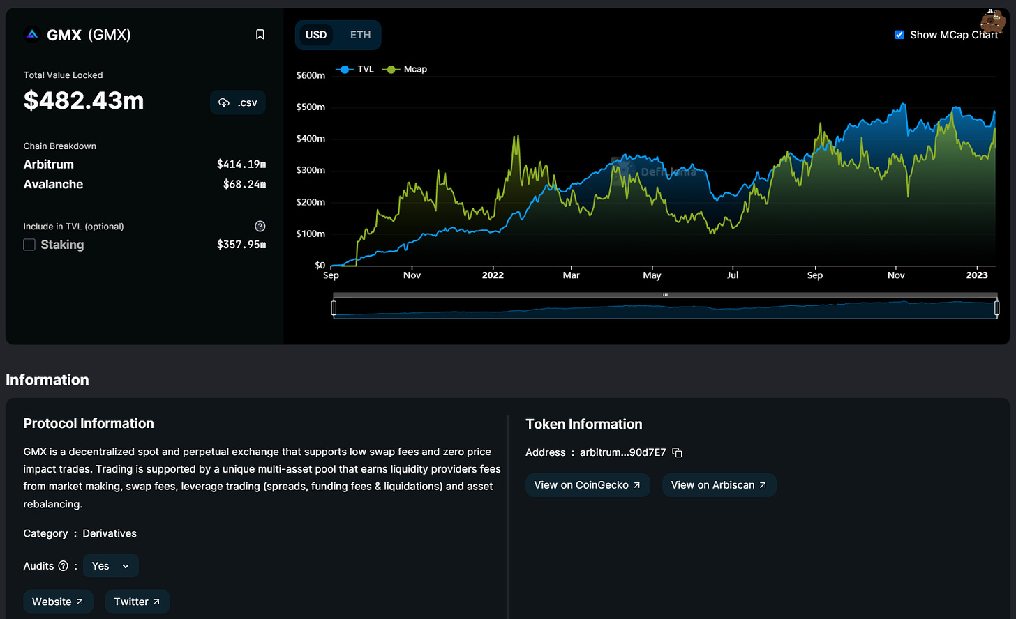 Similarly, if you wanted to review the TVL stats of a particular app, e.g. GMX, just click on its name in the TVL Rankings section, after which you’ll be taken to that project’s bespoke stats and overview page, like so: