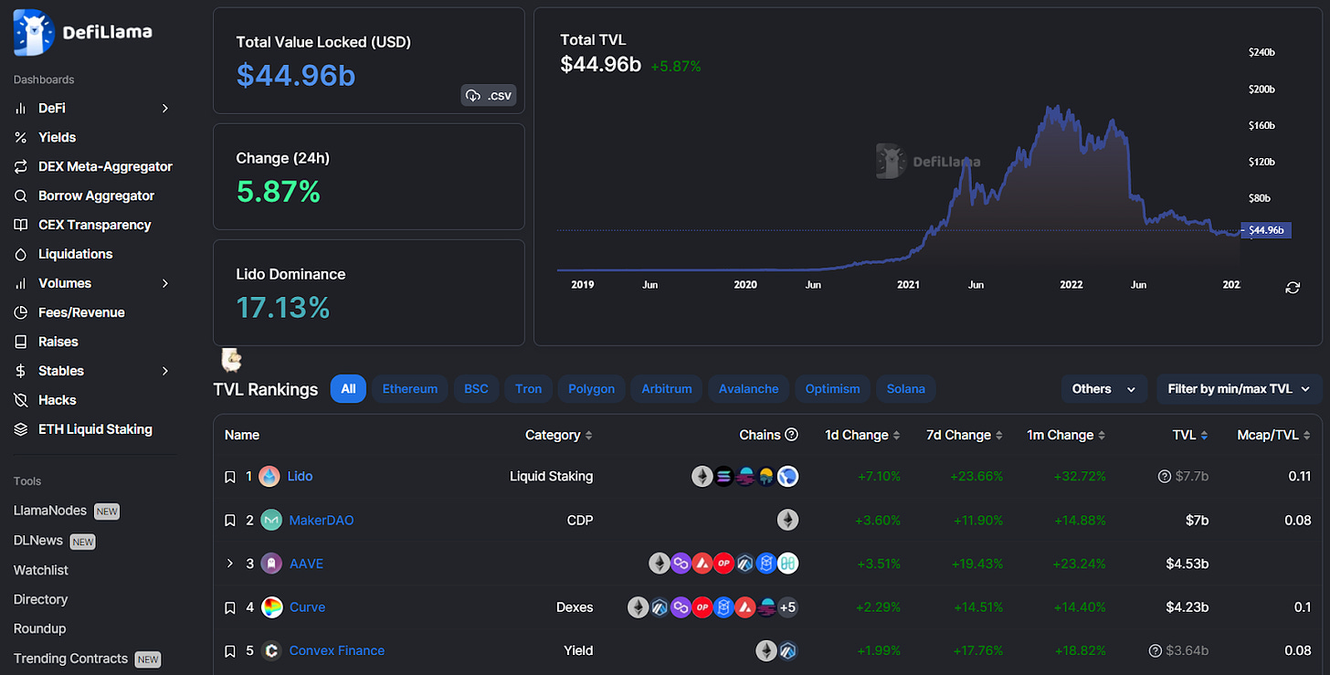 As a visitor you’re immediately presented with DeFi’s current aggregate TVL — i.e. the total value of crypto locked in DeFi projects across the +150 chains DeFiLlama tracks — which was ~$45B USD at the time of this post’s writing.