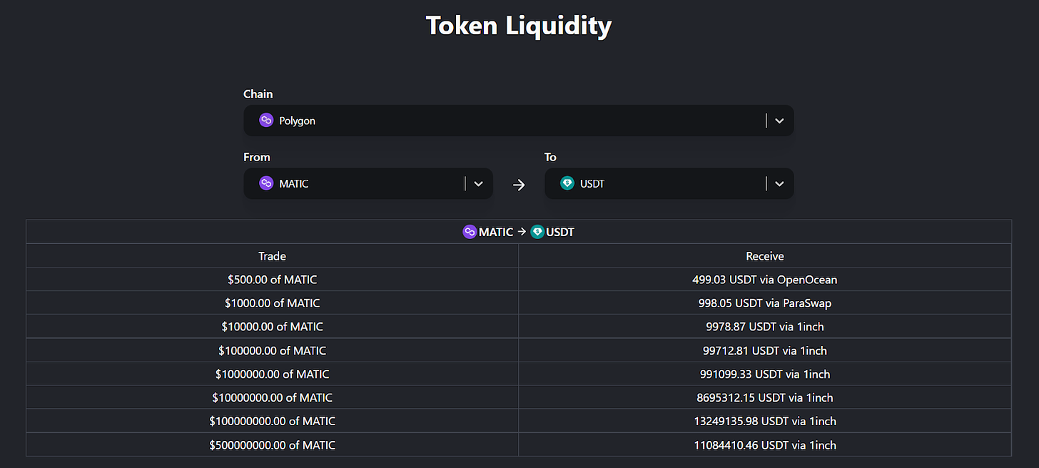 Polygon presently supported) - 💧 Token Liquidity — a search tool for quickly finding the most liquid trading avenues for token pairs on the most popular DeFi chains