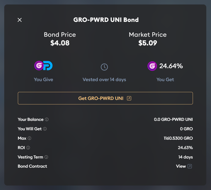 For example, on Olympus Pro you can presently bond your GRO-PWRD UNI LP tokens to purchase GRO for $4.25 per token, a discount from GRO’s spot price of $5.18 right now.