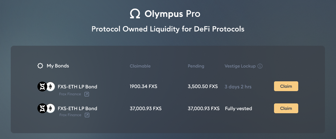 - Once you’ve purchased bonds, the Olympus Pro dashboard will show you a “My Bonds” section where you can find your “Claim” options. For example: