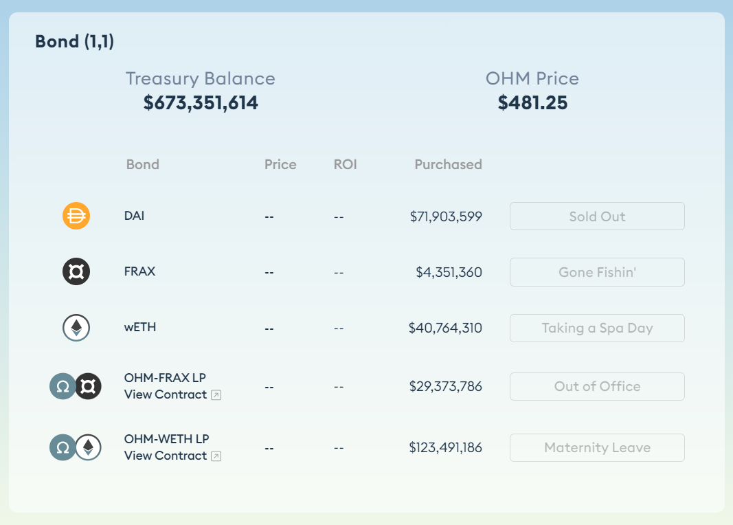 Specifically, the system entails Olympus users buying bonds for discounted OHM tokens that vest linearly for 5 days. The project currently has bonds for DAI, FRAX, WETH, OHM-FRAX LP tokens (