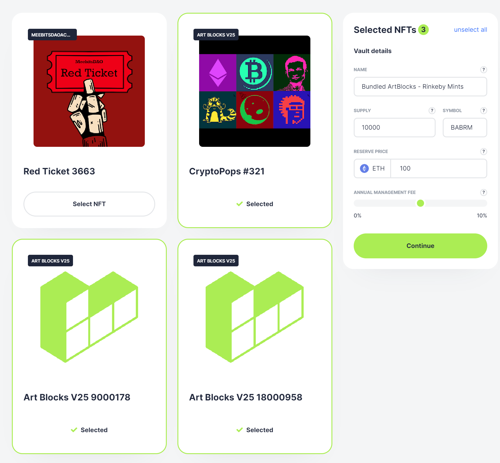 - You’ll be taken to an interface where you can choose the NFT or NFTs you want to fractionalize. Then input your vault’s name, token supply, token symbol, reserve price, and management fee.