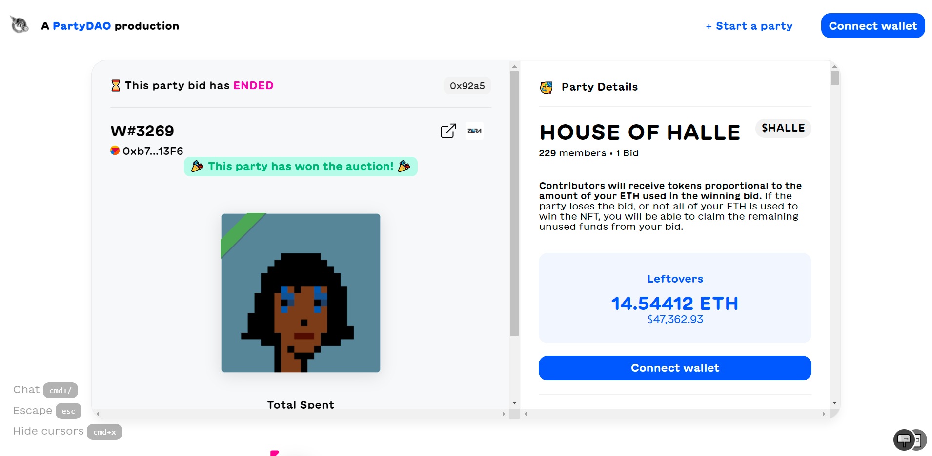 PartyBid is a decentralized app for facilitating collective bidding on NFTs. The dapp allows groups of friends and/or strangers to raid bid (“raid” in the gaming sense) on choice NFTs together, granting regular investors strength in numbers versus whale collectors for the first time in the NFT ecosystem.