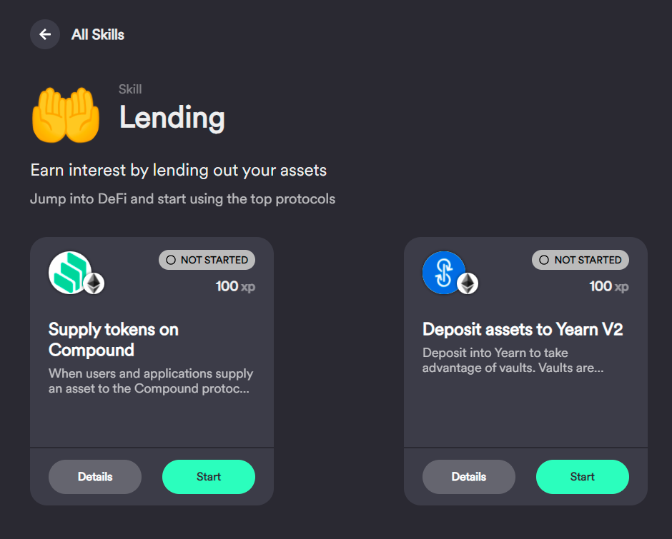 Now it’s up to you to decide what Skills challenges you want to start with. Each challenge you successfully complete earns you XP points, and some activities yield more points than others. These activities will cost gas, so you can convert your Coinbase Earn rewards to ETH, MATIC, etc. to help cover these expenses if you want.