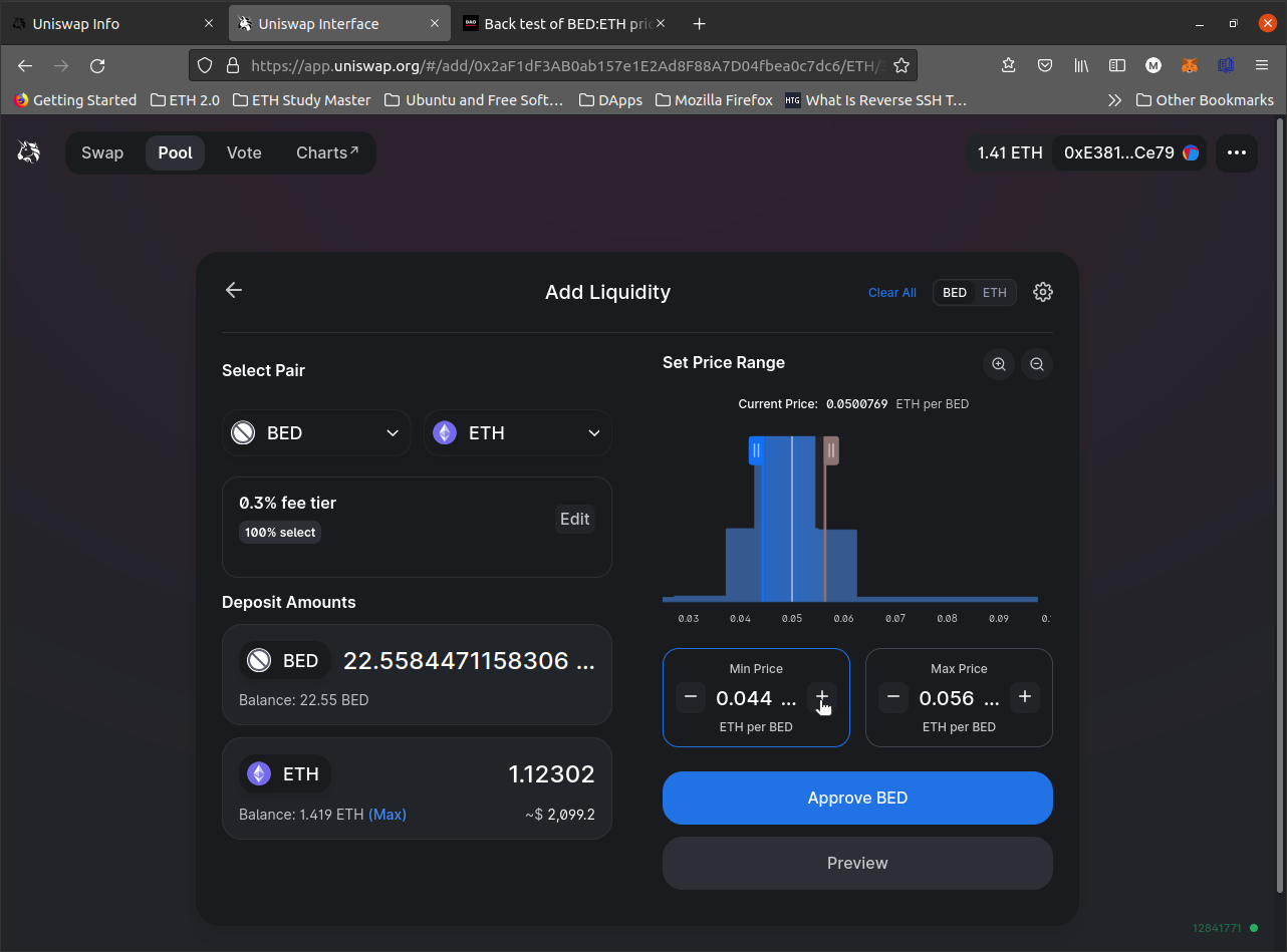 - Input the amount of BED/WETH you want to provide and determine your desired liquidity range. If you need help determining the price range, read up on this post from Over Analyser (tl;dr: +/- 12.5% is the general recommendation w/ moderate active management).