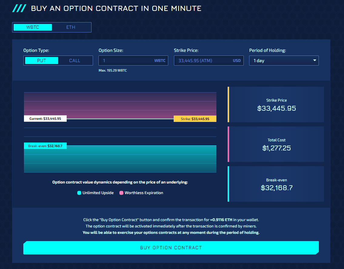 Pick the asset you want to buy a put or call on (popular choices are, you guessed it, ETH and WBTC), choose the setup that’s best for you, and then fire off a purchase transaction.