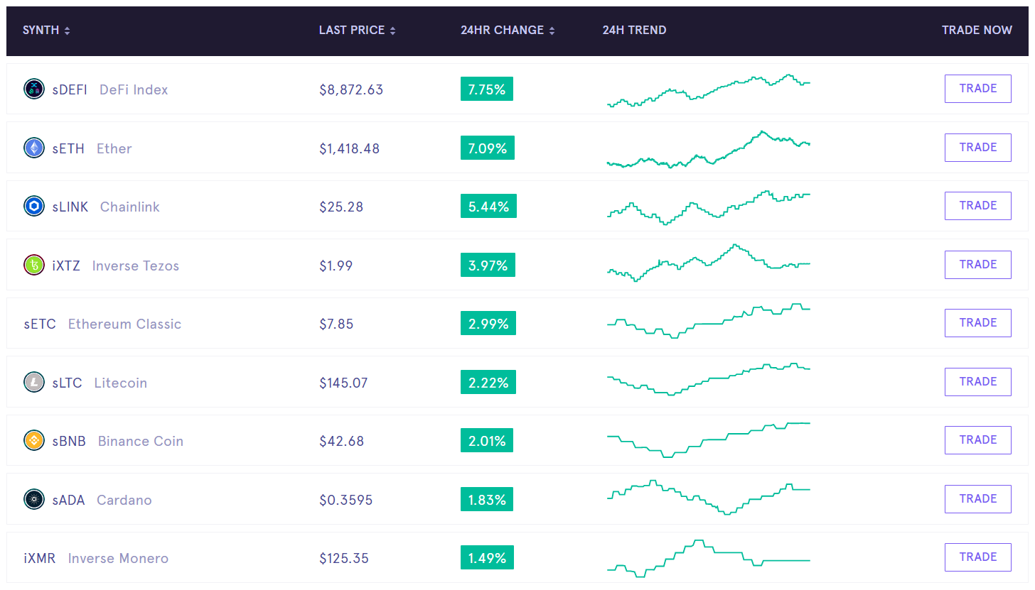 Synthetix also offers ‘Inverse Synths’. Inverse Synths, like iETH or iBTC, allow traders to short assets because they gain in value when the underlying asset depreciate in value.