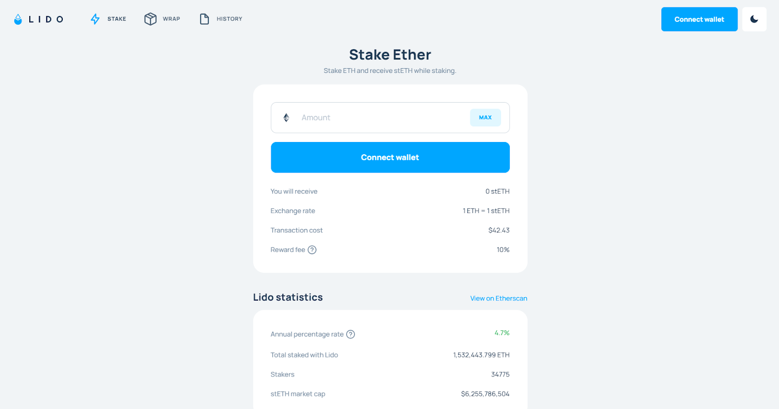 - Visit stake.lido.fi and connect your wallet. For any chain surfers, make sure you’re connected to the Ethereum network.