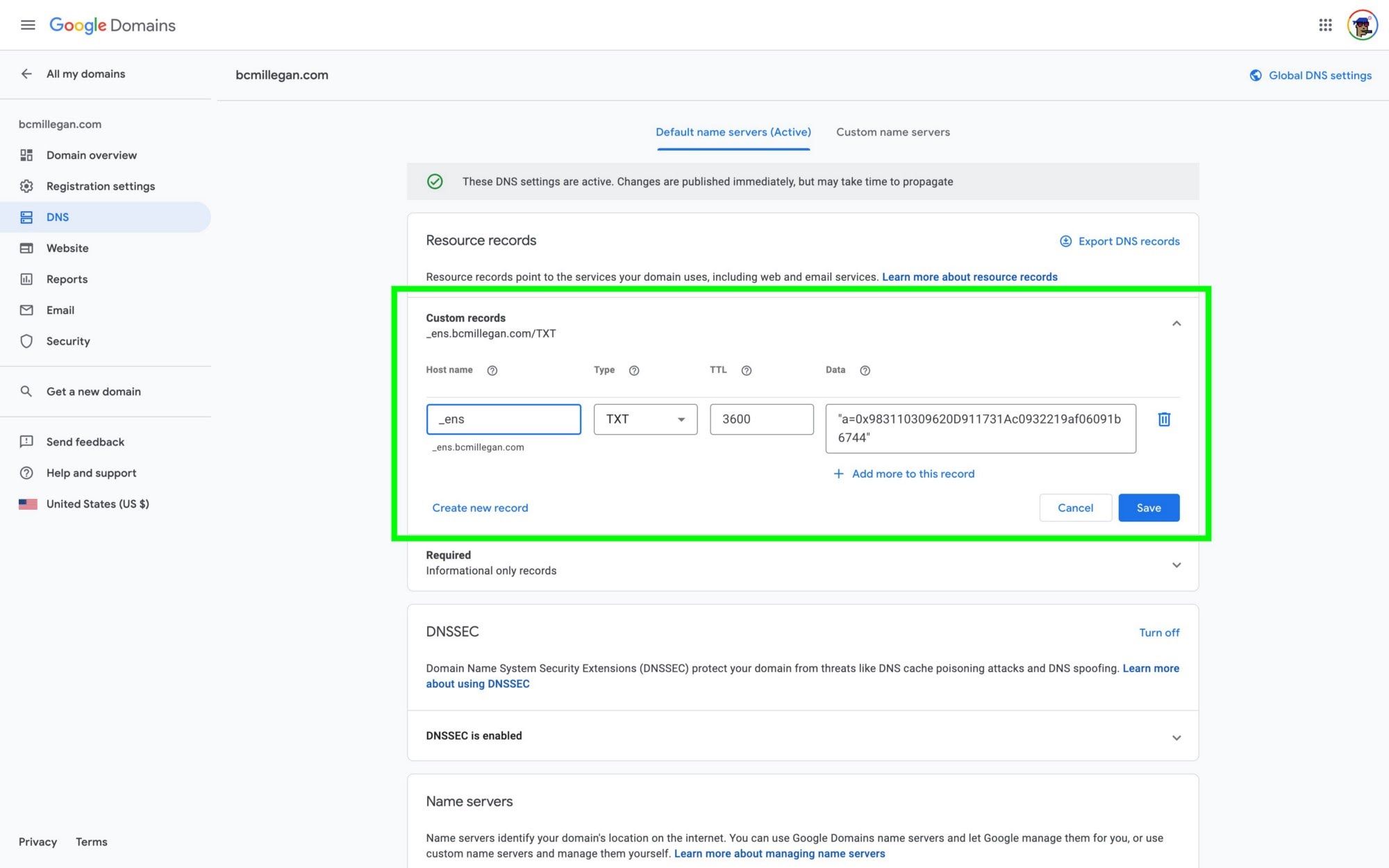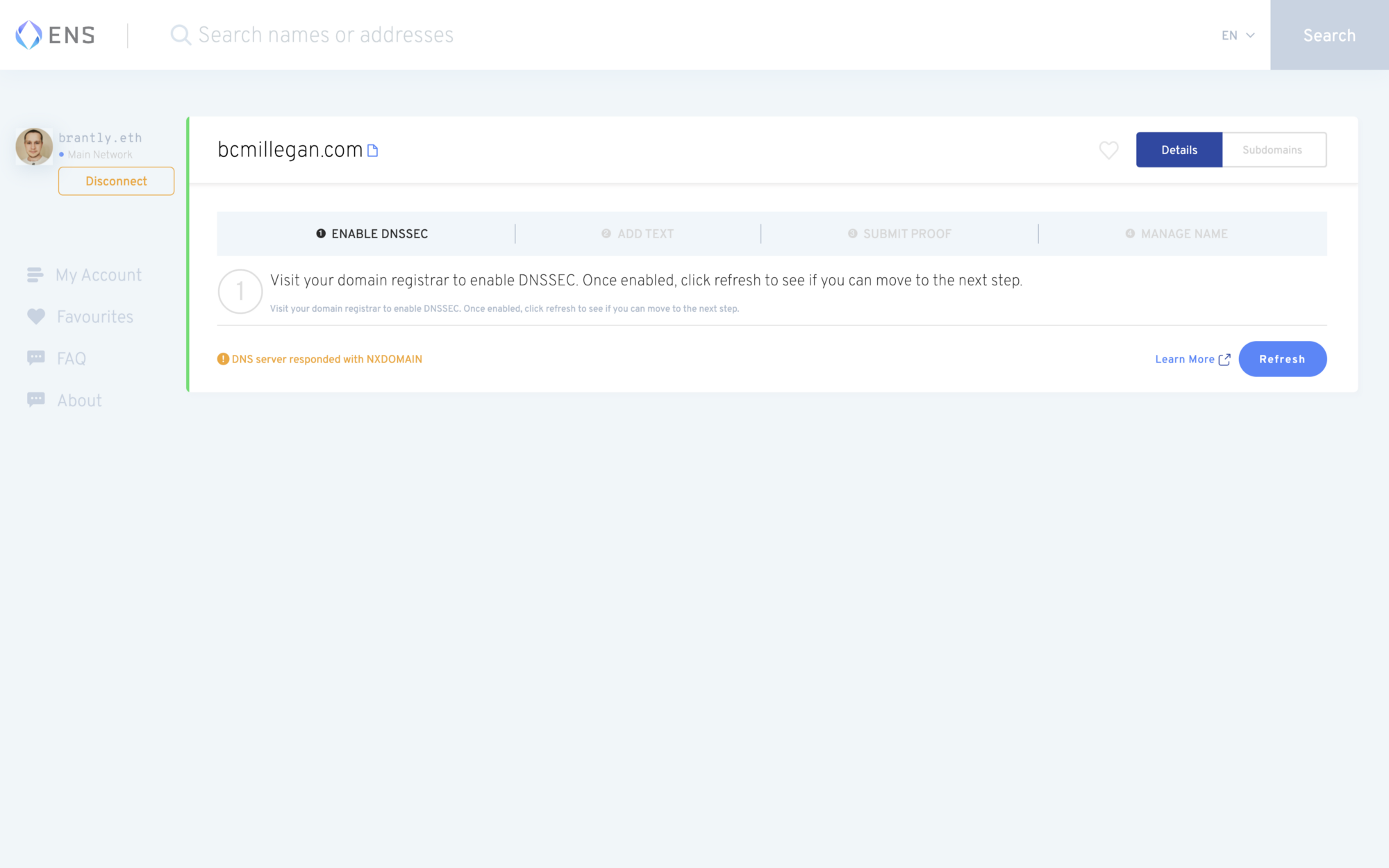 - At this point, return to your domain’s page in the ENS Manager App to check and see if your new TXT record and DNSSEC settings have come through. This process could take hours, so don’t worry if you don’t see results immediately.