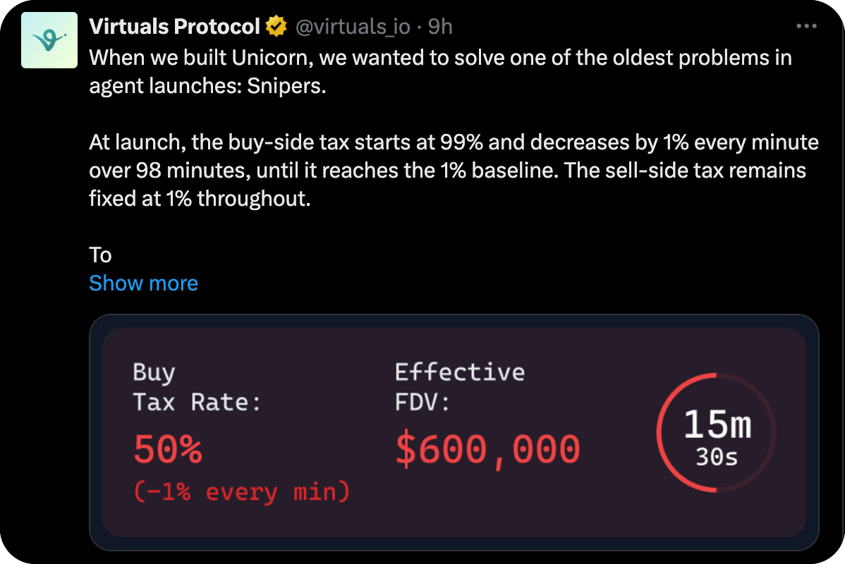 - How it Works in Unicorn: Now, anyone can trade immediately once a project goes live at a low starting valuation — no gating, no caps. A 24-hour evaluation window sits between a launch page's creation and trading, giving the community time to review before liquidity activates. In an attempt to fend off bot activity, an anti-sniper tax starting at 99% and decaying to 1% launches with the token initially, with collected taxes used to buy back the agent token itself.