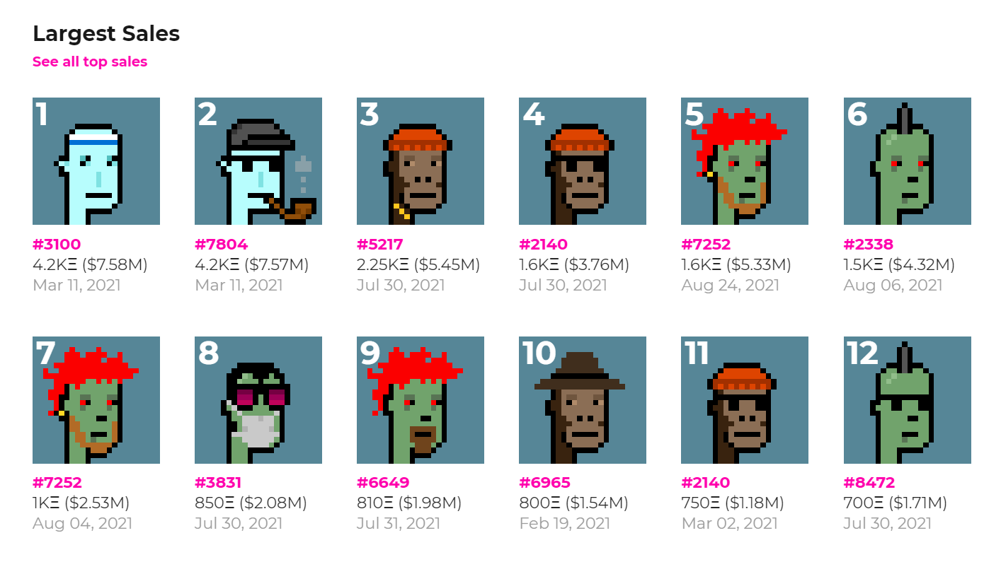 Demand grows: The 12 largest CryptoPunks sales to date have all taken place in 2021. Of these dozen sales, 8 have taken place this summer and 3 during this August alone.