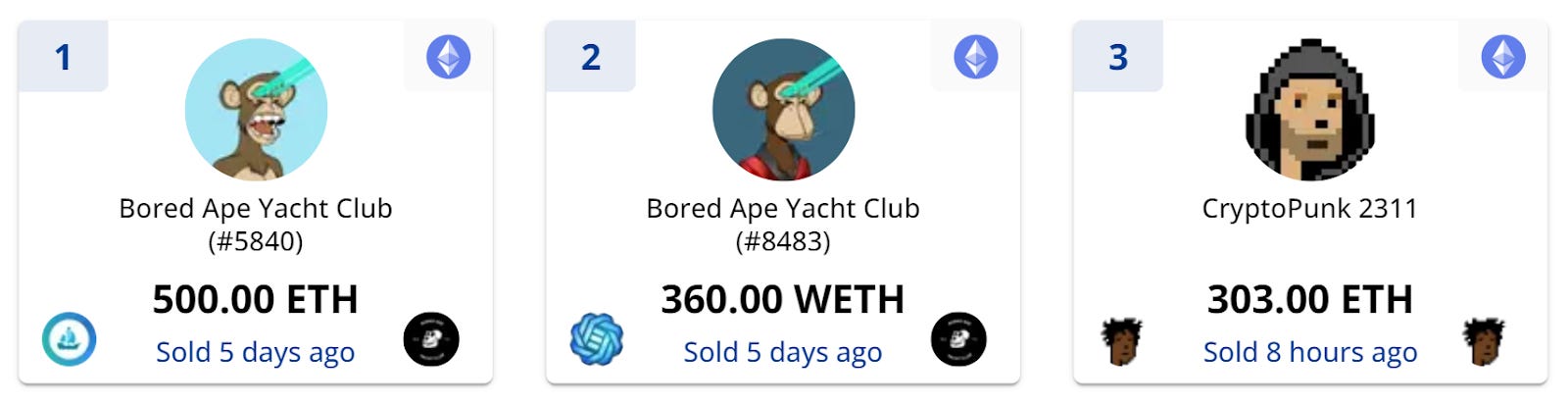 There have been more monster BAYC and ‘Punk sales in recent days per usual at the top of the NFT economy. Considered together the three transactions below amounted to over Ξ1,160, suggesting that demand for top-shelf NFTs is doing just fine right now.