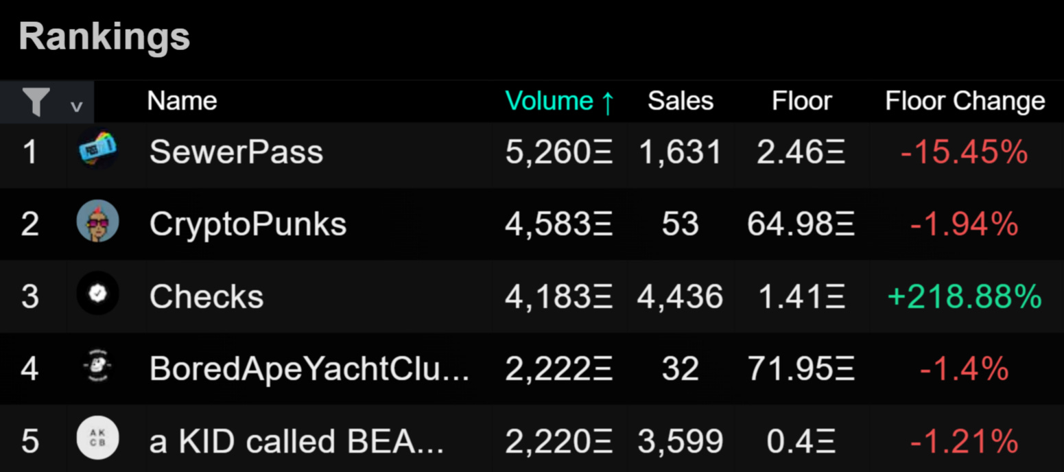 While collections in the Bored Ape ecosystem proper have dominated the weekly volume charts for the past month, this week had a bit more variety with CryptoPunks, Checks, and a KID called BEAST coming in as the 2nd, 3rd, and 5th most-traded collections respectively. The big stunner has been Checks, which cost the equivalent of $8 to mint last month and has now seen its floor price surge to well over Ξ1 ETH a pop.