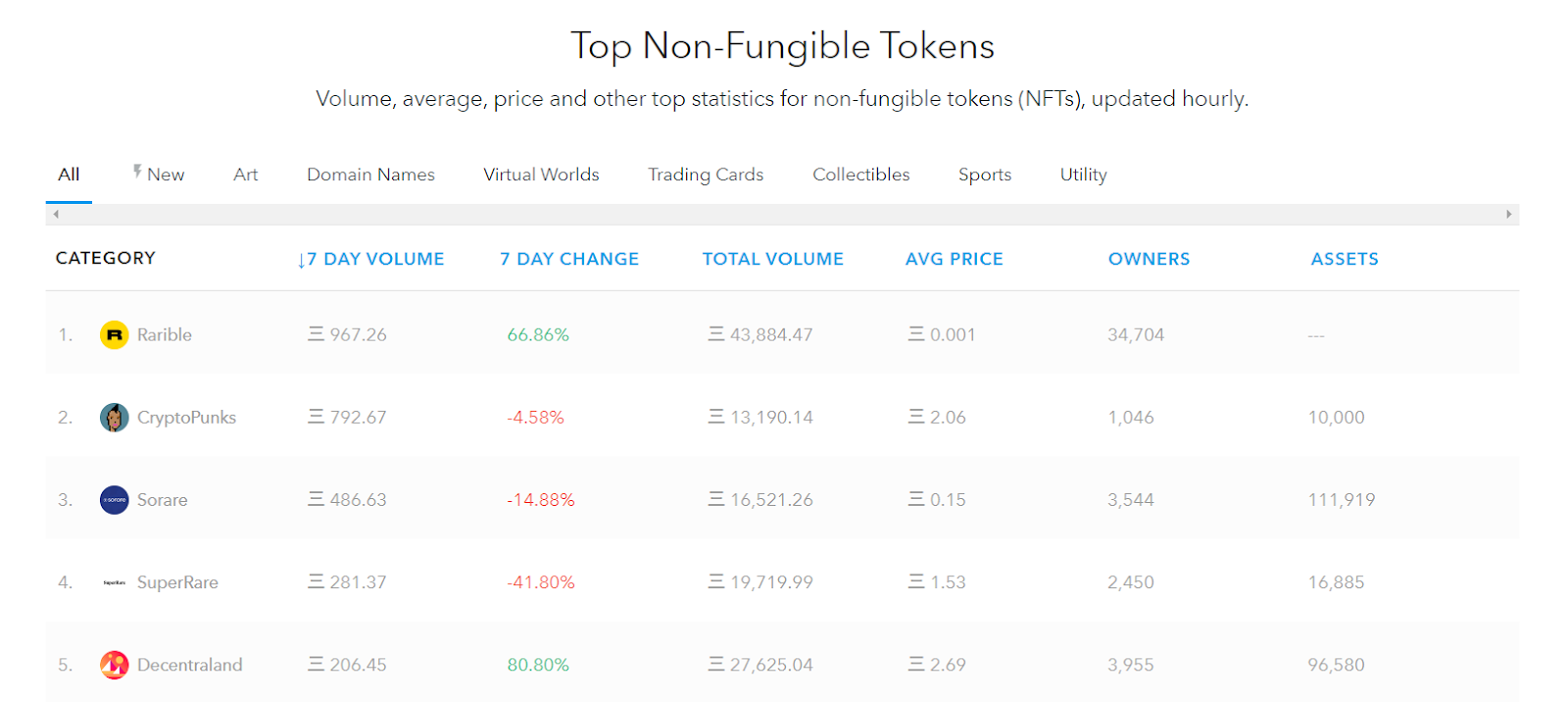 What to know: Check out NonFungible's Market Overview page. Here, you can readily find 7-day volume and sales, sort through historical data, and search by category (e.g. art, games, Metaverse land).