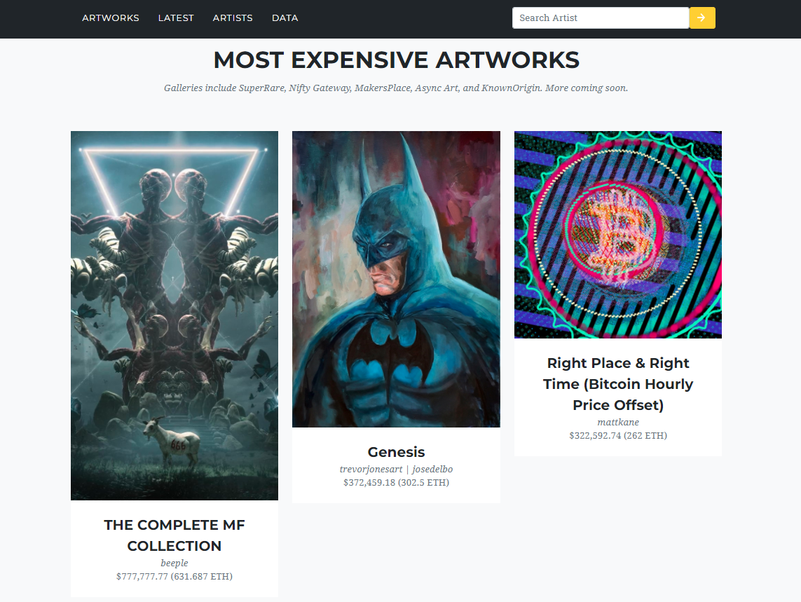 Cryproart.io is a new data tracker site specifically tracking happenings in the blooming NFT-based cryptoart space. Created by Richard Chen, the service covers activity around top artists, high-profile NFTs, and more.
