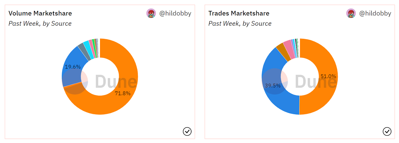 Notably, Blur’s stranglehold on the NFT economy receded some over the past week, during which its volume marketshare dropped from 77% to 72% and its trades marketshare dropped from 56% to 51%. That’s not a massive plunge, but it is stark difference from recent weeks whenBlur either was gaining ground or staying steady in its dominance. Is this decline a sign that the pull of $BLUR rewards are starting to wane? For now, we’ll just have to wait and see.
