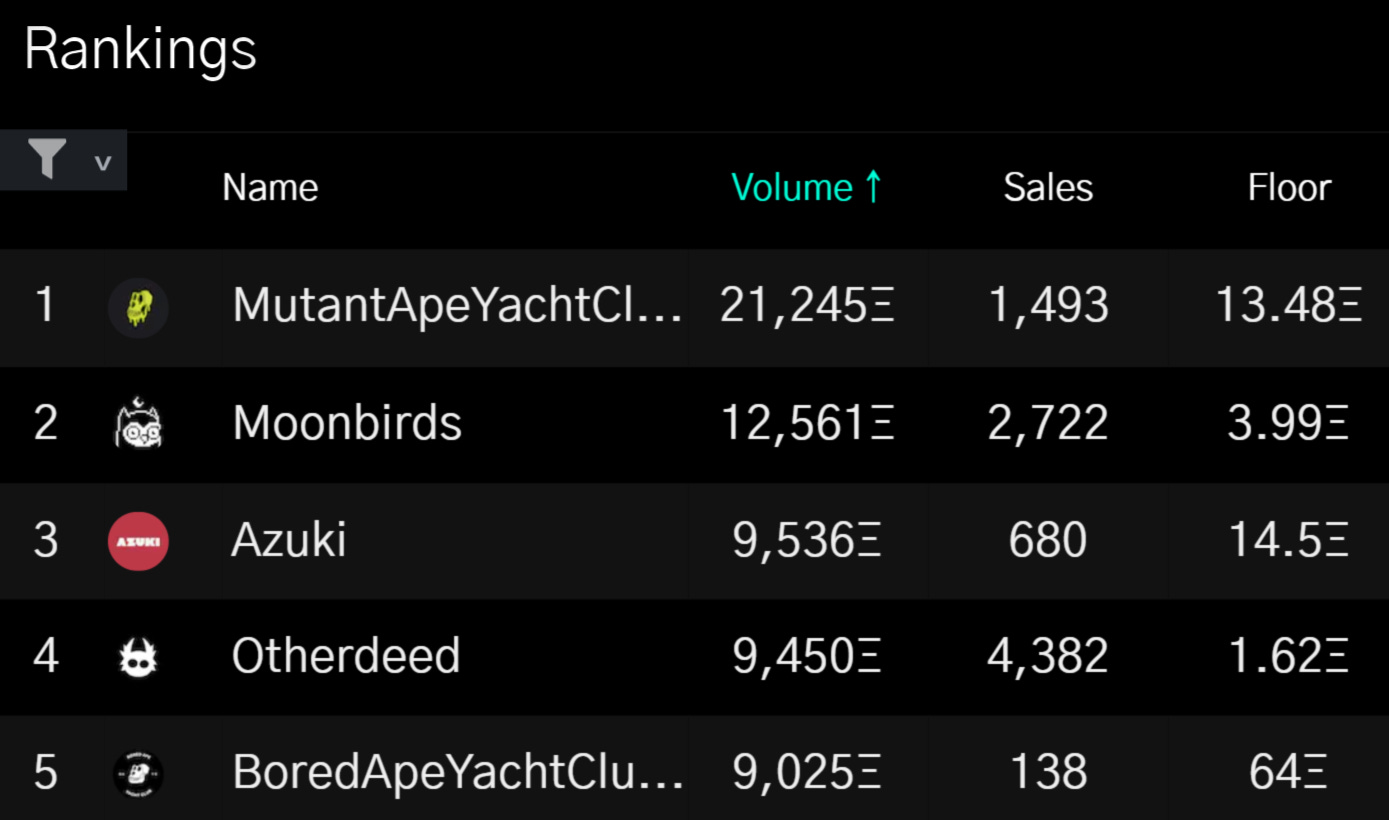 Another week, another dominant performance by MAYC atop the 7D NFT volume charts. TheMoonbirds collection also continues to see major volume activity, too, as bear market blues has lately led to surges of buy and sell pressure around the project. Azuki, Otherdeeds plots, and BAYC all facilitated over 9k ETH worth of trades on the week to round out the top five here.