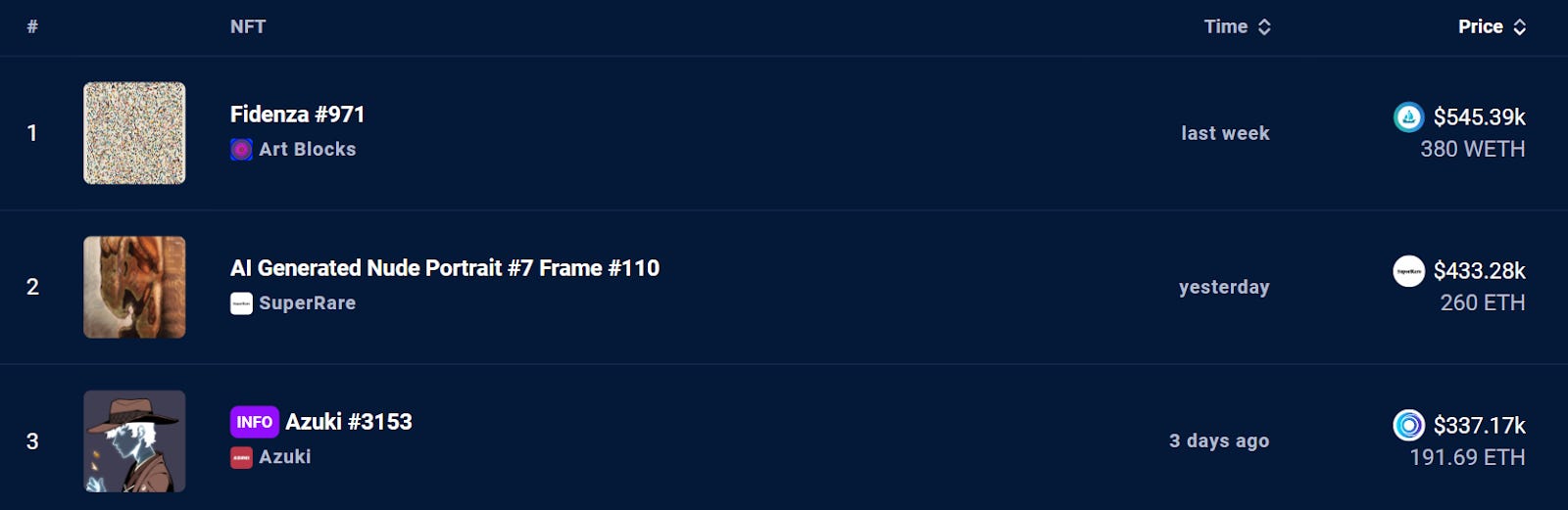 It was a cryptoart-themed week for the space’s top 7D NFT sales, as a Fidenza and a classic Lost Robbie sold for 380 ETH and 260 ETH respectively. Rounding out the top three largest transactions was a 191.69 ETH sale of Azuki #3153, a rare “Spirit” type from the PFP collection.