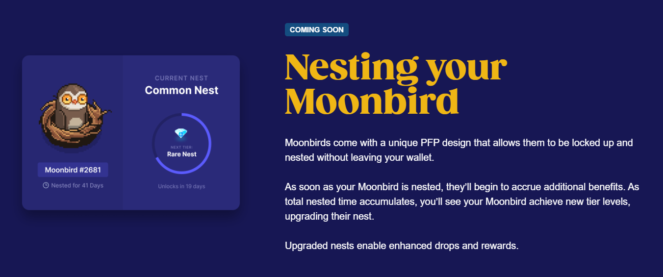 - The Moonbirds nesting mechanic is slated to launch later this month. Expect to see more and more NFT projects experiment with this sort of rewards system going forward, as it incentives collectors to hold their NFTs.