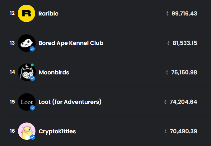 - Since launching this weekend the Moonbirds collection has accounted for a whopping +75k ETH worth of trading volume. At the time of this post’s writing, demand had pushed the collection’s floor price to ~19 ETH (a 660% ETH gain from the 2.5 ETH mint cost).