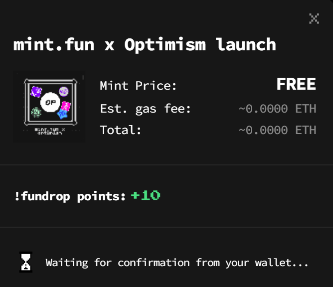 Next you’d press the “Mint” button, switch your network if prompted by your wallet (e.g. to Optimism in this case), and then take a final pass at reviewing the mint info. If everything looks good complete the mint transaction and voila, that’s all it takes to mint L2 NFTs on mint.fun! It’s super affordable, too — when I minted the “Optimism launch” NFT while writing this post, the transaction only cost 0.000018 ETH worth of gas, or $0.04 USD.