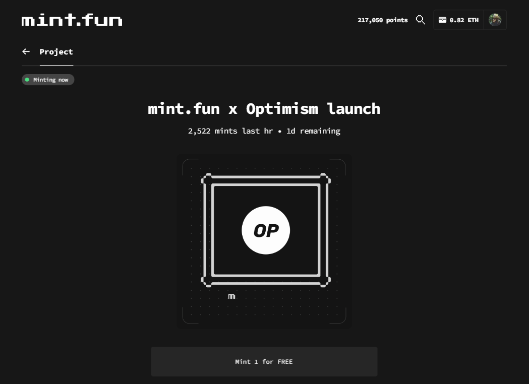 At the time of writing, the featured project on the platform was the free commemorative mint.fun x Optimism launch NFT, which we’ll use as an example here. So you can click on the name of the project that’s caught your eye, after which you’ll be brought to a dedicated mint page like so: