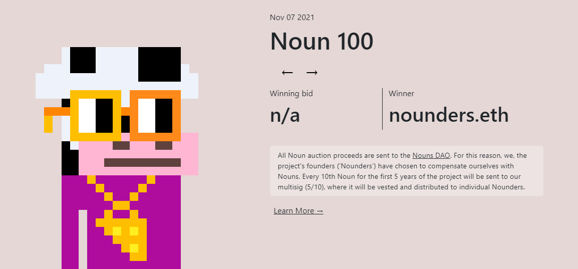 The Nouns DAO project reached its 100th Noun this week 🎉
