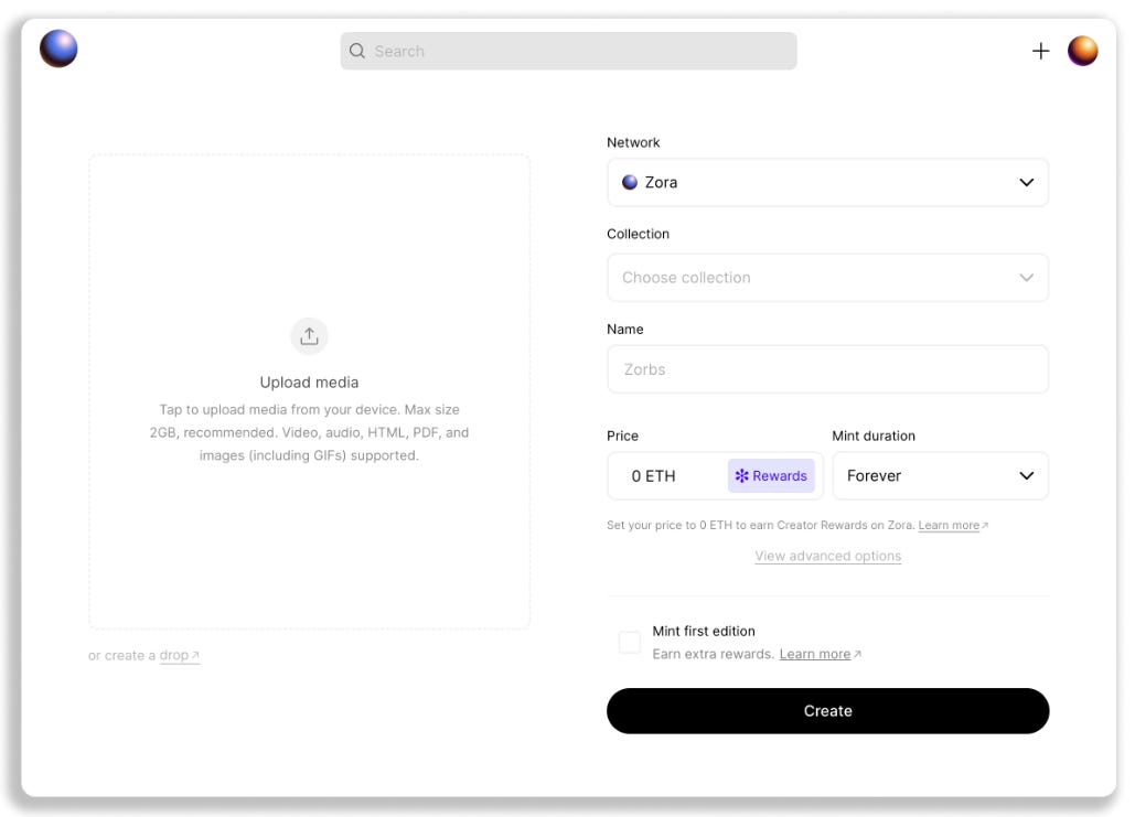 - ⏯️ Get started — Click the “+” Button in the top right corner of the page to initiate the creation process, this will take you to zora.co/create.