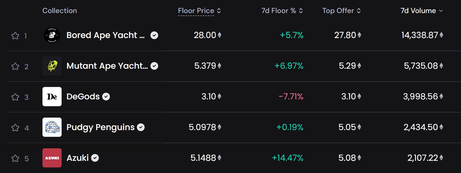 Over the past week, the floor-based market cap of the NFT space declined from 5.3 million ETH to 5.1 million ETH for a 3.77% drop ⤵️