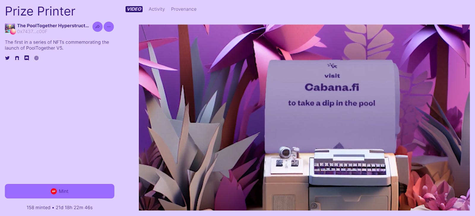 PoolTogether, the no-loss prize savings game, just launched its v5 protocol. The new release comes with an array of updates, including more assets and a simpler prize flow. If you’ve got any idle DAI, USDC, or WETH around, you can put them into action on the new cabana.fi website, and if you want to support and commemorate the release, PoolTogether’s just dropped Prize Printer as the first in a series of v5-themed NFTs.