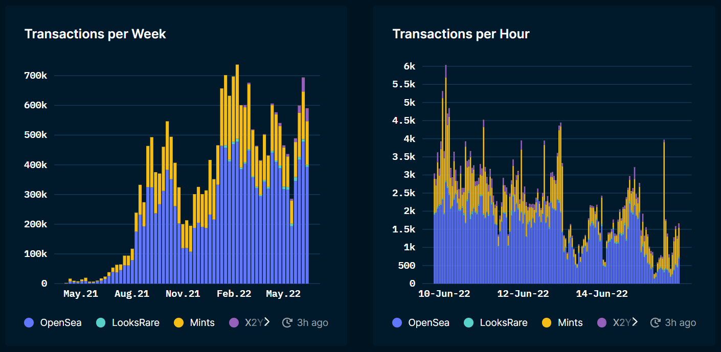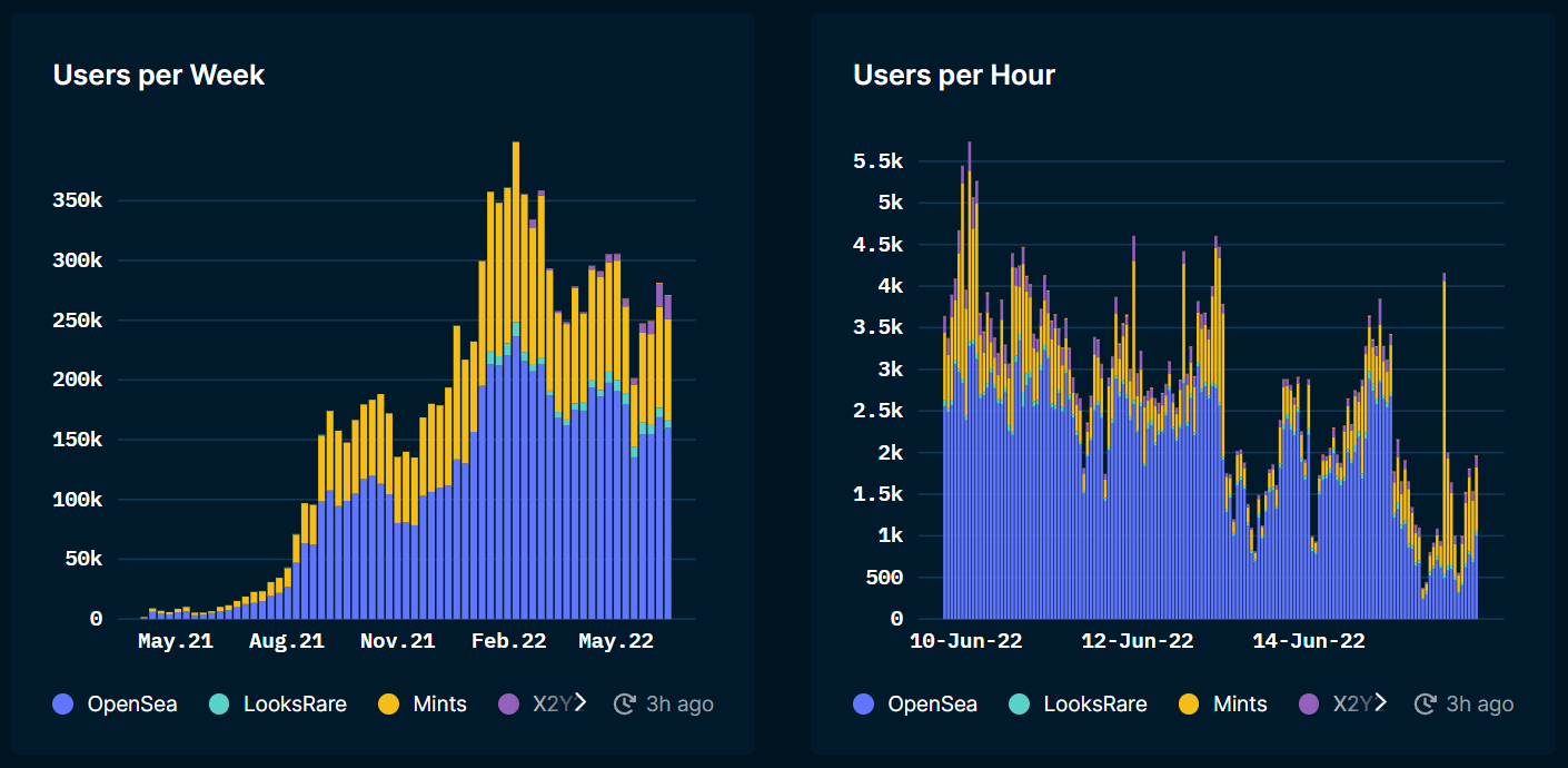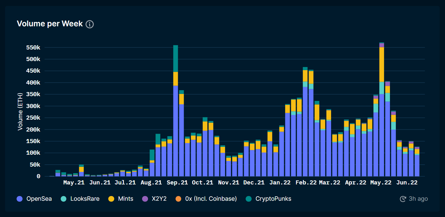 As of June 13th, 2022, there were still ~275k weekly NFT users on Ethereum. This sum is higher than what was seen at any point in 2021, which was notably the NFT ecosystem’s first big boom year. However, the current ~275k weekly users stat still marks a drop off of nearly 30% from the standing all-time high, ~390k weekly users, which was notched in February 2022.