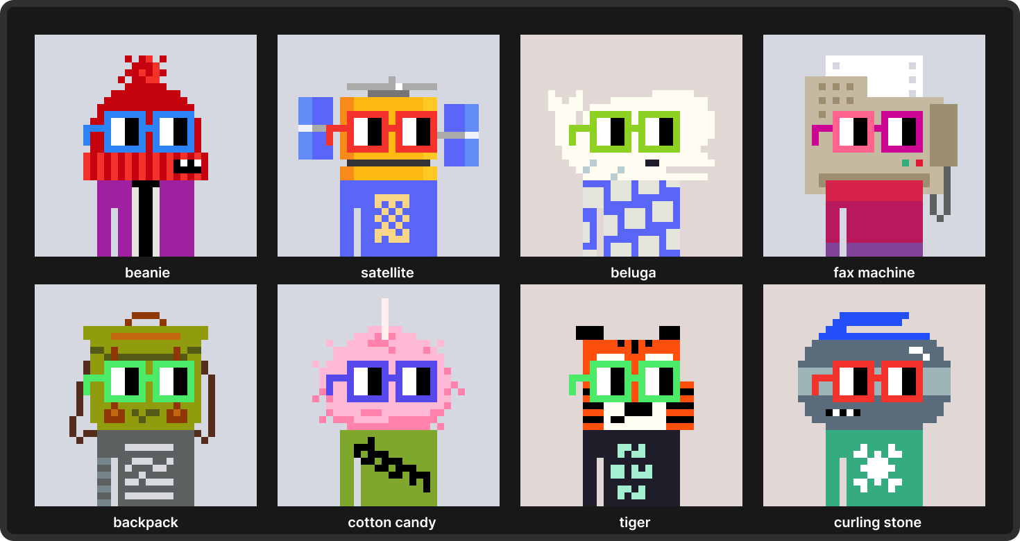 The aforementioned Prop 348 recently passed, adding new traits to Nouns DAO’s art generator system including eight new heads: Backpack, Beanie, Beluga, Cotton Candy, Curling Stone, Fax Machine, Satellite, and Tiger.