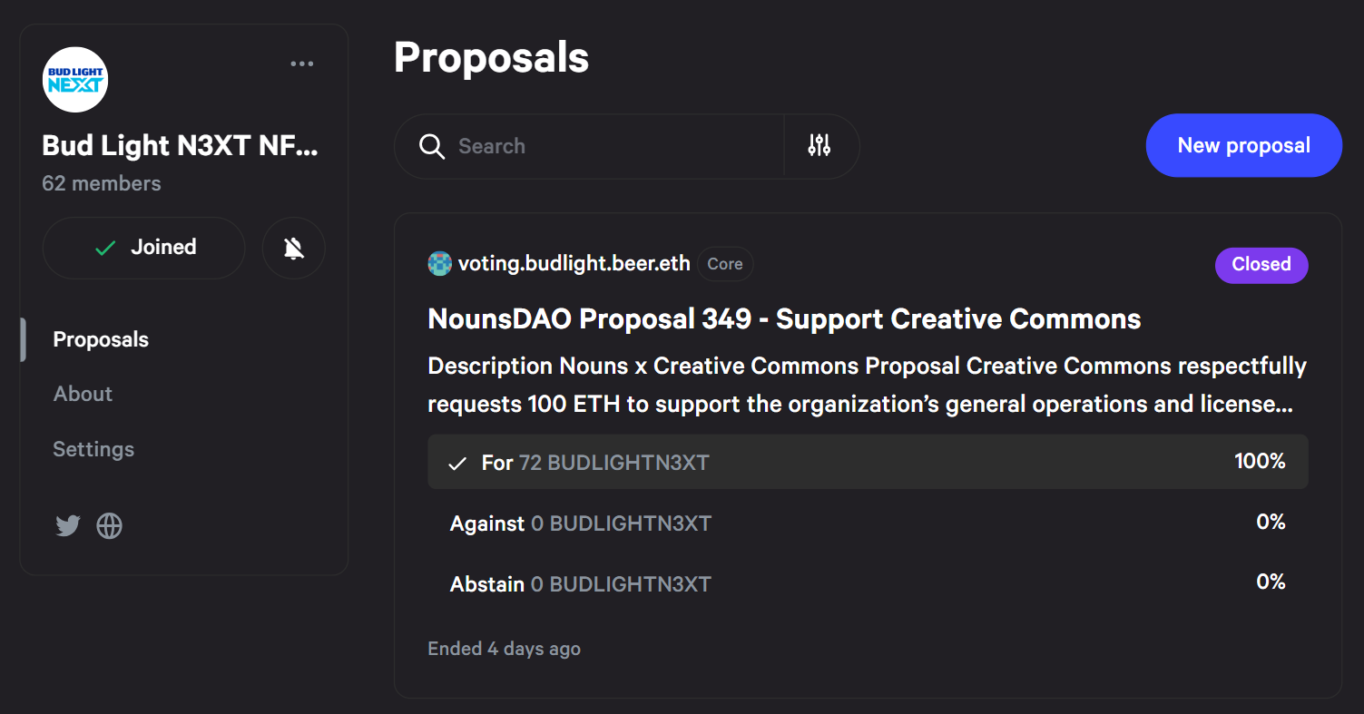 A different option is owning a Bud Light N3XT NFT, whose floor price is ~0.023 ETH right now. Owners of these NFTs are able to collectively decide via Snapshot how the aptly beer-headed Noun 179 votes in Nouns DAO for any given vote.