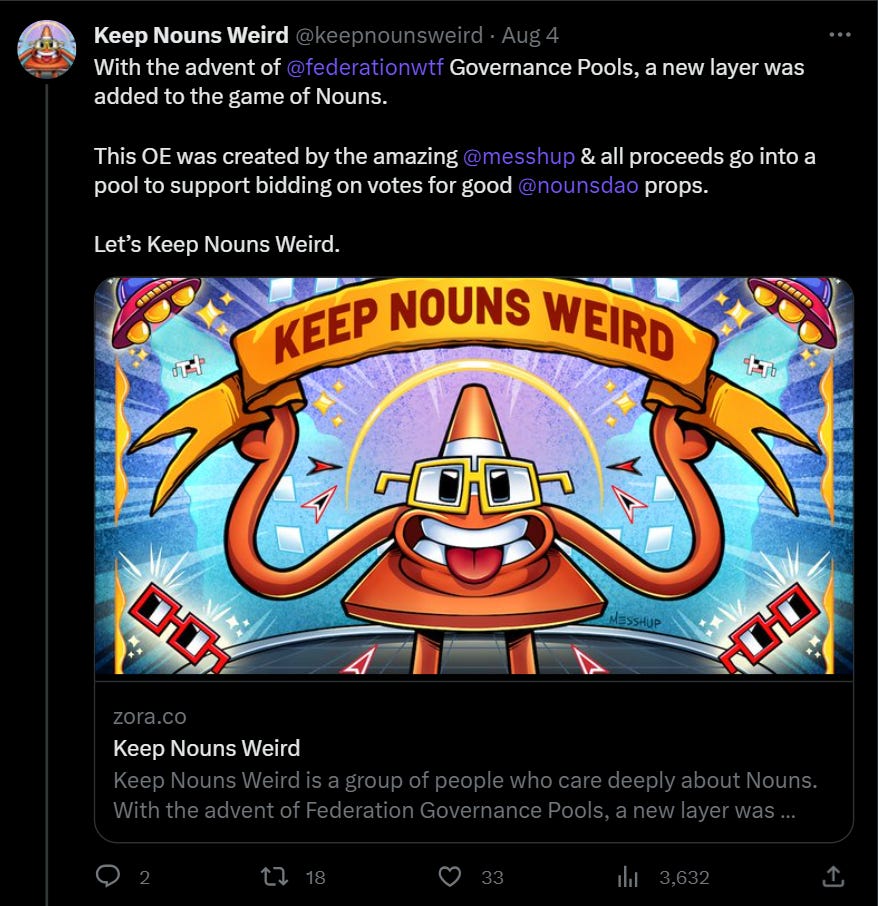 Of course, it remains to be seen how the new V3 system will play out, but if you’re interested in DAOs generally, this Nouns forking drama is worth watching closely over the coming months. Personally, I’ll keep supporting efforts to keep Nouns weird and creatively industrious no matter what happens!