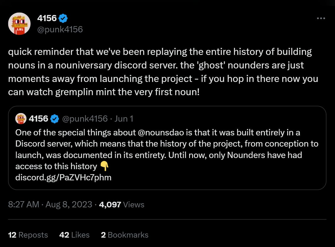 Set up in honor of Nouns DAO’s second birthday, over the past many weeks this server has played back the initial “Nounder” discussions and collaborations that resulted in the launch of the DAO on August 8th, 2021. It’s a gold mine of info and inspiration, so check it out if you want to study how the project was created from the ground up.