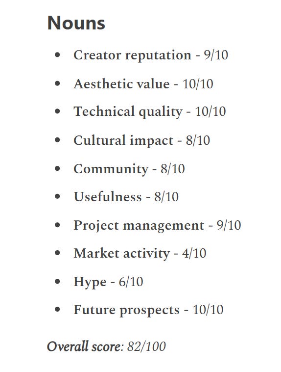 I’ve tested the system out on +30 top NFT projects to date, and Nouns remains the highest-scoring project I’ve seen yet.