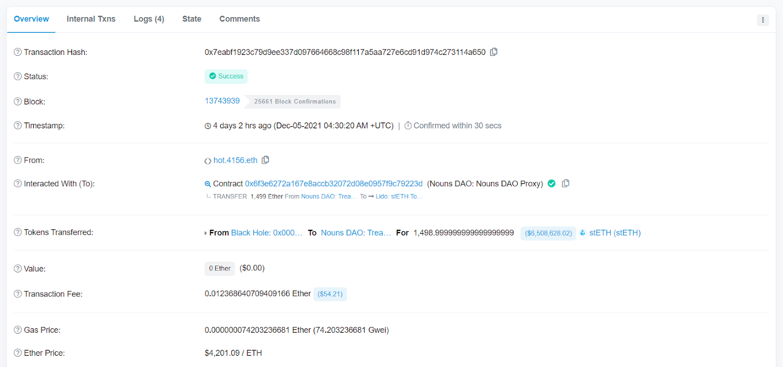 The news: On Dec. 5th, Nouns DAO completed its Lido staking plans and received its second installment of 1,498.99 stETH. Accordingly, the group now has both ETH and yield-bearing stETH on its balance sheet.