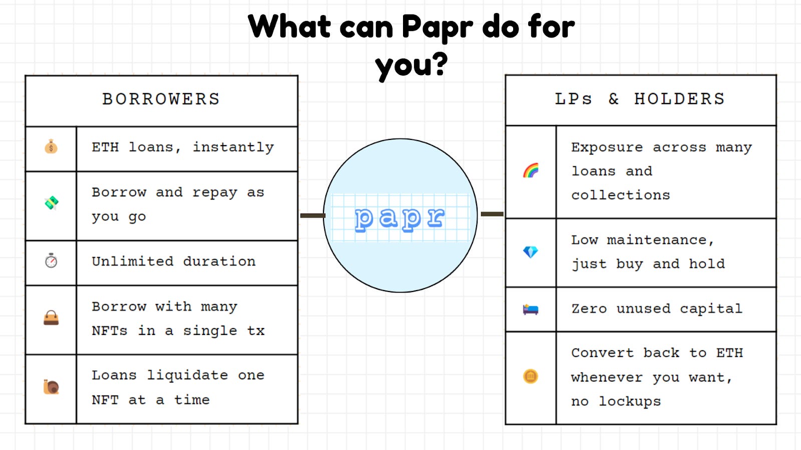 As for lenders and/or liquidity providers, the Papr token offers holders a singular, low-maintenance way to gain exposure to loans across multiple NFT collections, with the first Papr token, $paprMEME, providing exposure to loans across over 20 popular collections and counting.