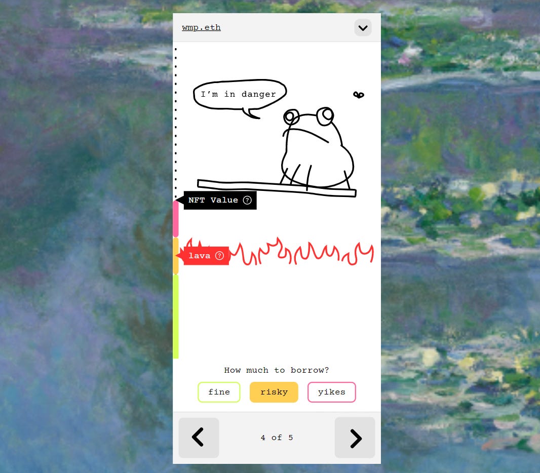 If you connect your wallet to the platform, the Toad will walk you through the process over the course of 5 steps. You could then select a supported NFT that you want to borrow against and then decide how much to borrow. The Toad will caution you on how risky your position is set to be, like so: