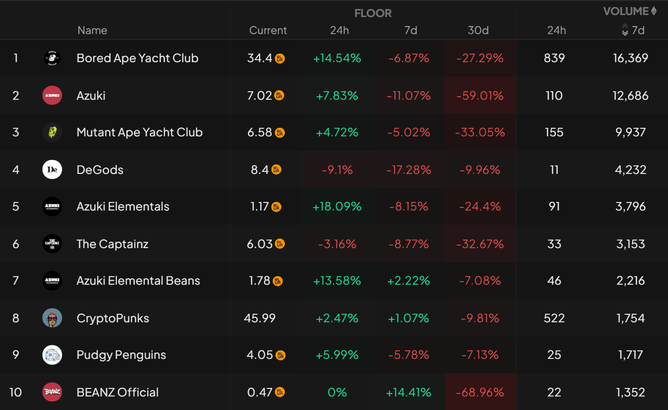 Over the past week, the floor-based market cap of the NFT space dropped from 7.91 million ETH to 7.43 million ETH for a 6% decline.