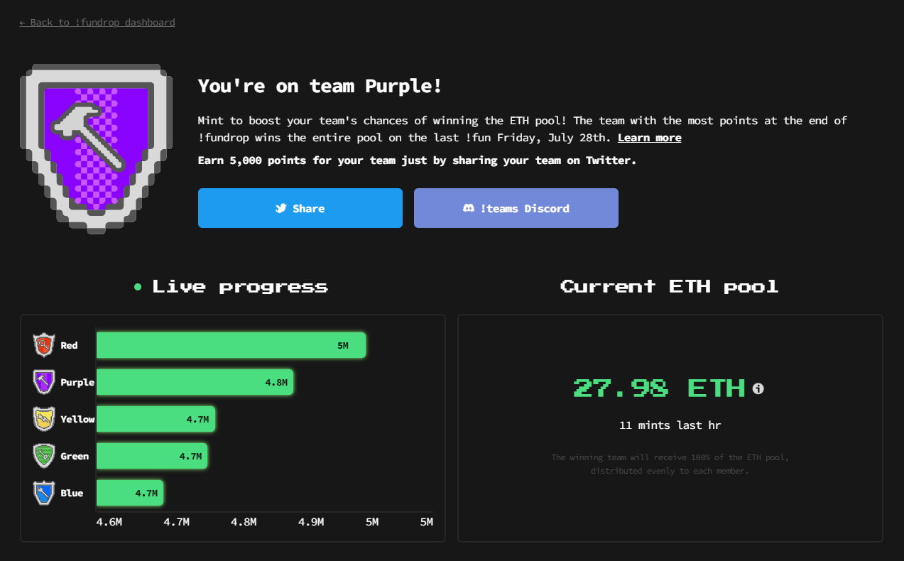 mint.fun just introduced !teams, a group minting competition. Minters are randomly assigned to teams (I got Team Purple💜), and each member’s points contribute to their team’s total score. The contest offers a chance to win from a growing ETH prize pool, bonus !fun rewards on mint.fun, and other prizes. Learn more by visiting the !teams FAQ. Keep in mind that one mint is 0.0025 ETH, and the contest concludes on July 28th!